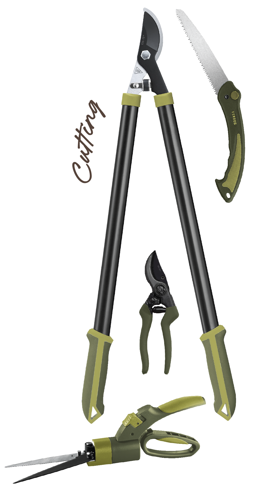 The TERROS core line includes watering, cutting, and digging tools — available in both hand and long-handle formats.